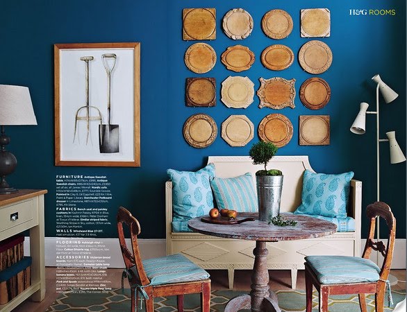 The appeal of a plate wall is obvious. It brings decorative dishes out of hiding while filling a large space that might be expensive to cover with actual art. For those who love a particular style of dish, such as the ironstone plates in the first image, a plate wall makes a feature out of a cherished collection. Even a narrow wall seems suddenly interesting when a cluster of plates is strategically arranged on it. In a room that already has a lot of interest, plates of a single color do the trick without overwhelming the senses. While in a paired-down space, a grouping of patterned plates contributes color. I especially love the plates that form the unorthodox canvas for an oil painting while framing the new work.